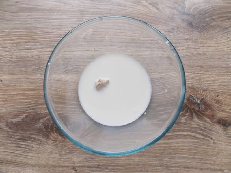 Молоко немного подогрейте, оно должно быть теплым, но не горячим. Добавьте в молоко дрожжи и размешайте до однородного состояния.