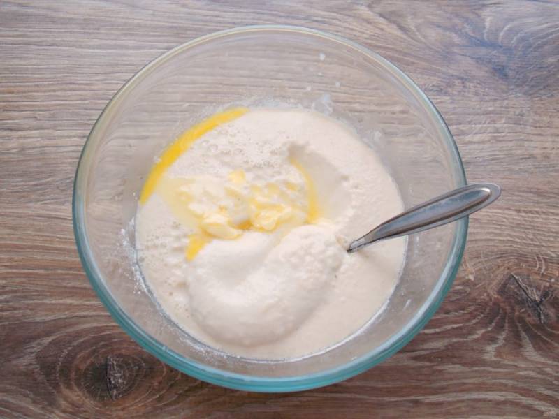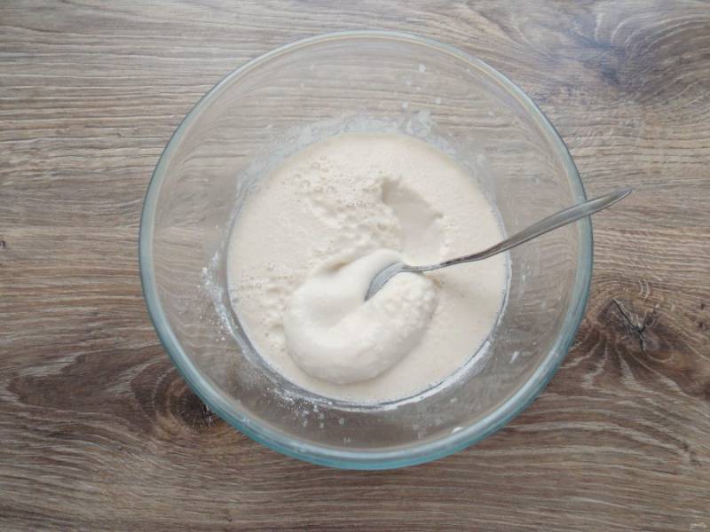Добавьте в молоко с дрожжами сахар и 3 столовые ложки муки. Все хорошенько перемешайте до однородной массы.