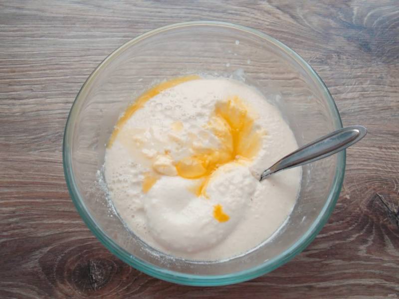 Яйцо разбейте в чашку, перемешайте, вылейте половину яйца в опару. Оставшееся яйцо уберите, оно пригодится для смазывания выпечки перед выпеканием.