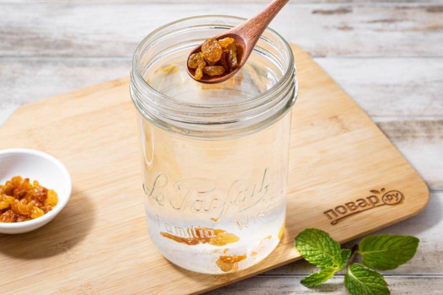 Добавьте изюм. Затяните банку марлей и оставьте при комнатной температуре примерно на 2 дня.