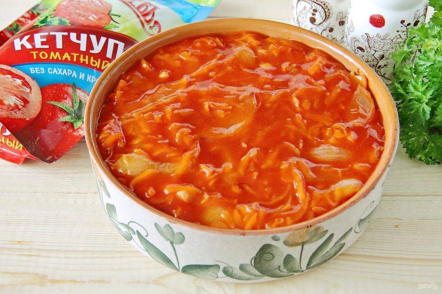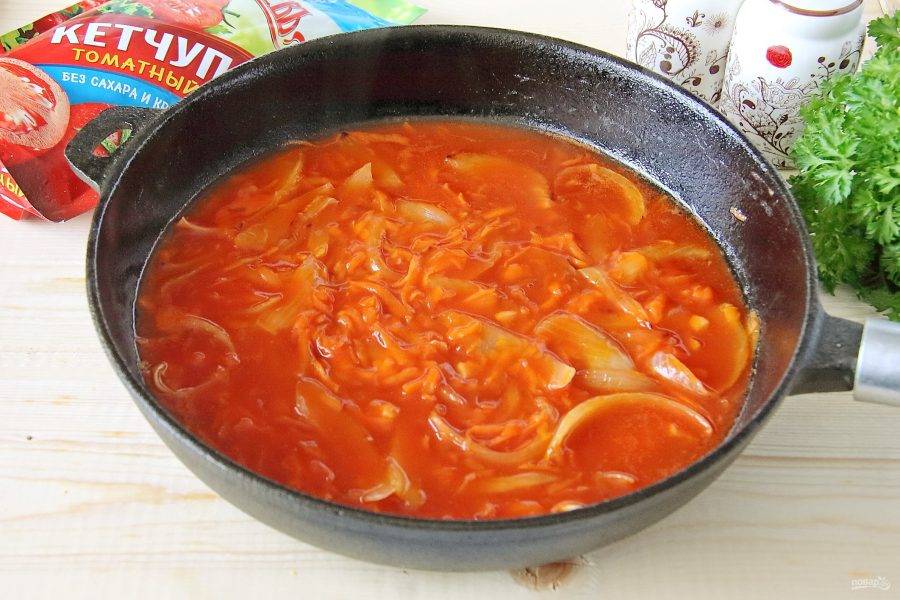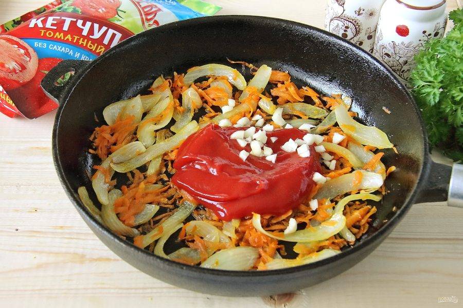 Добавьте томатный кетчуп (у меня "Махеевъ" без сахара и крахмала) и измельченный ножом чеснок.