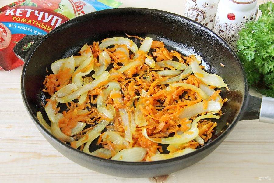 На сковороде обжарьте тертую морковь и лук, нарезанный перьями.