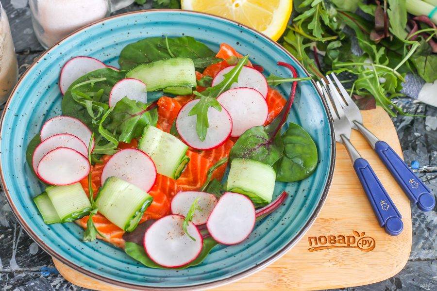 После чего промойте свежую зелень, нарвите ее руками на тарелку и выложите на нее ломтики промаринованной рыбы. Сверху дополните блюдо зеленью.