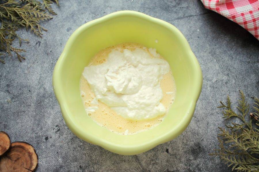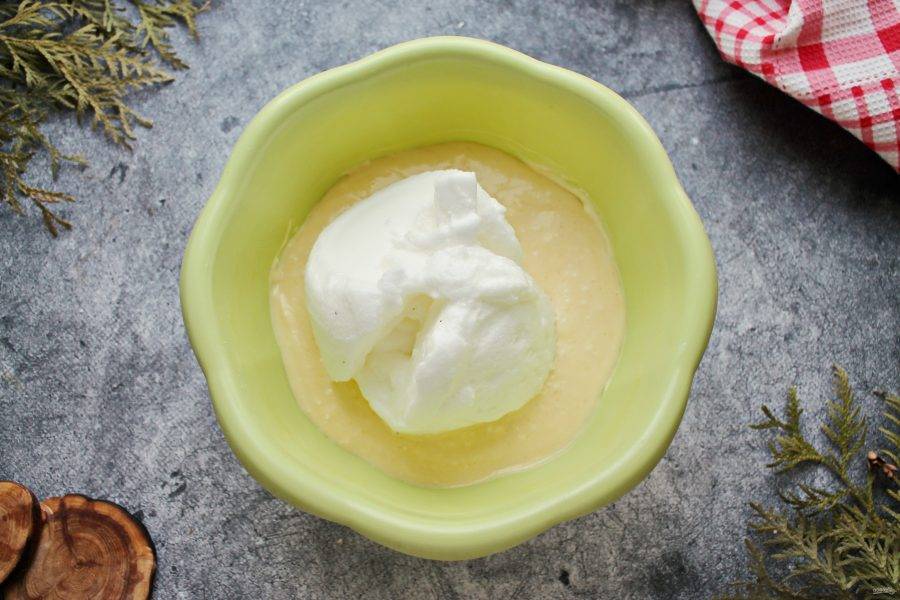 В яичную массу введите маскарпоне и перемешайте до однородности.
