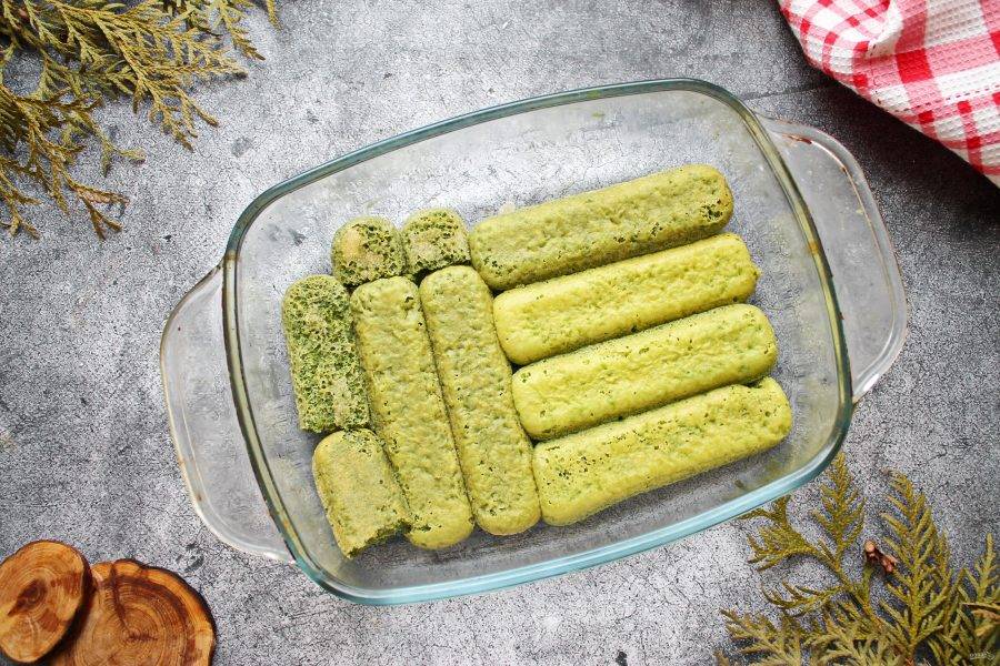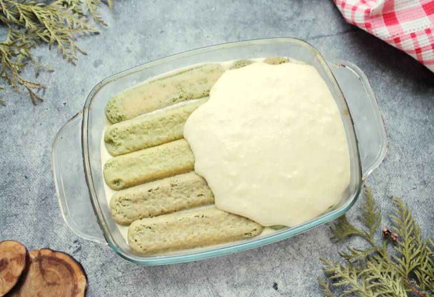 Выложите еще один еще один слой савоярди в чае матча. Сверху разровняйте оставшийся крем.
