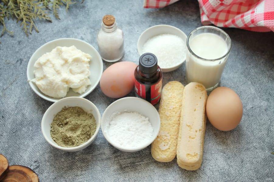 Подготовьте все необходимые ингредиенты для приготовления тирамису с чаем матча.