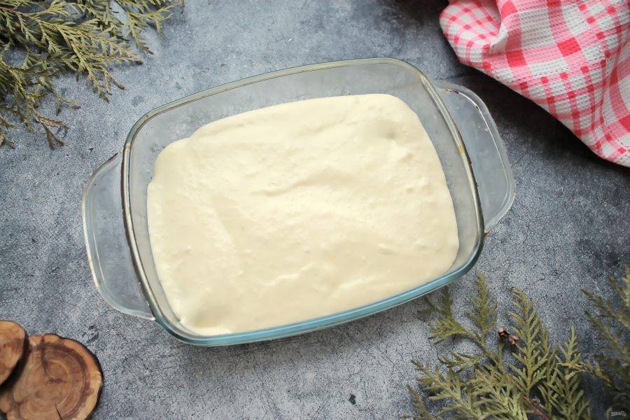 Сверху выложите половину сырной массы и разровняйте.