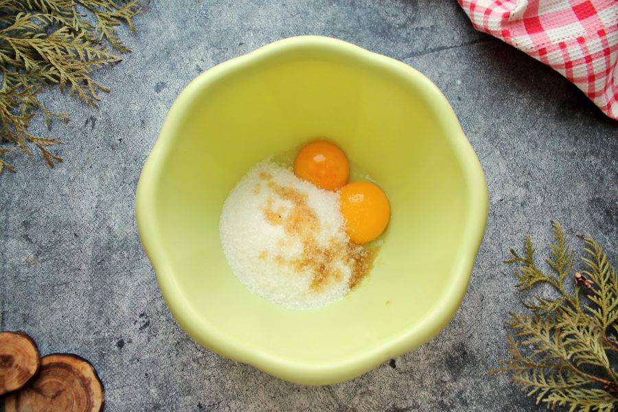 Разделите яйца на белки и желтки. В желтки всыпьте сахар, добавьте ванильную эссенцию.