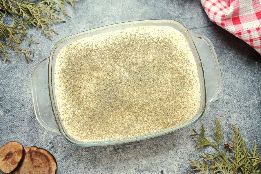 Сверху посыпьте сухим порошком чая матча, накройте и уберите в холодильник на несколько часов, чтобы все пропиталось и объединилось.