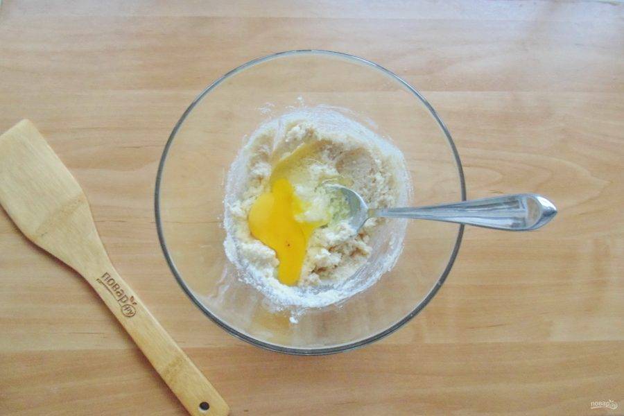 В миску выложите мягкое сливочное масло, добавьте сахар с корицей и хорошо перемешайте. Затем по одному добавьте в тесто два яйца.