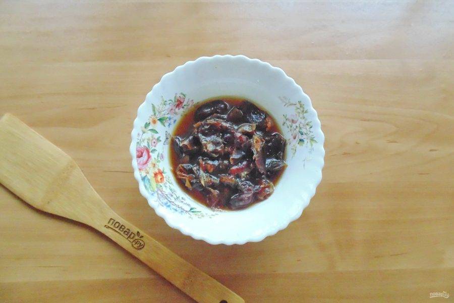Финики очистите от косточек и обдайте кипятком. После выложите в мисочку с чаем и дайте постоять 10-12 минут.