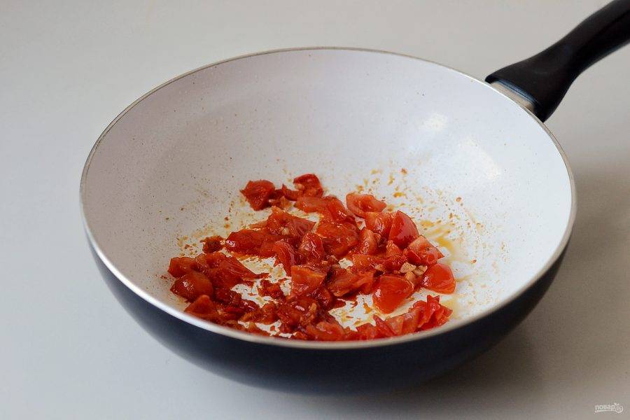 Слейте масло, оставив только немного на дне. Мелко измельчите имбирь и чеснок. Обжарьте немного, затем добавьте перец чили, томатную пасту и помидоры. Жарьте пару минут до мягкости.