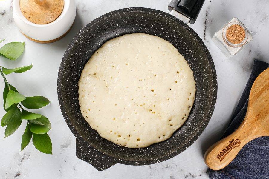 Не перемешивая, наливайте половником тесто и жарьте блины на смазанной маслом сковороде с двух сторон до золотистого цвета.