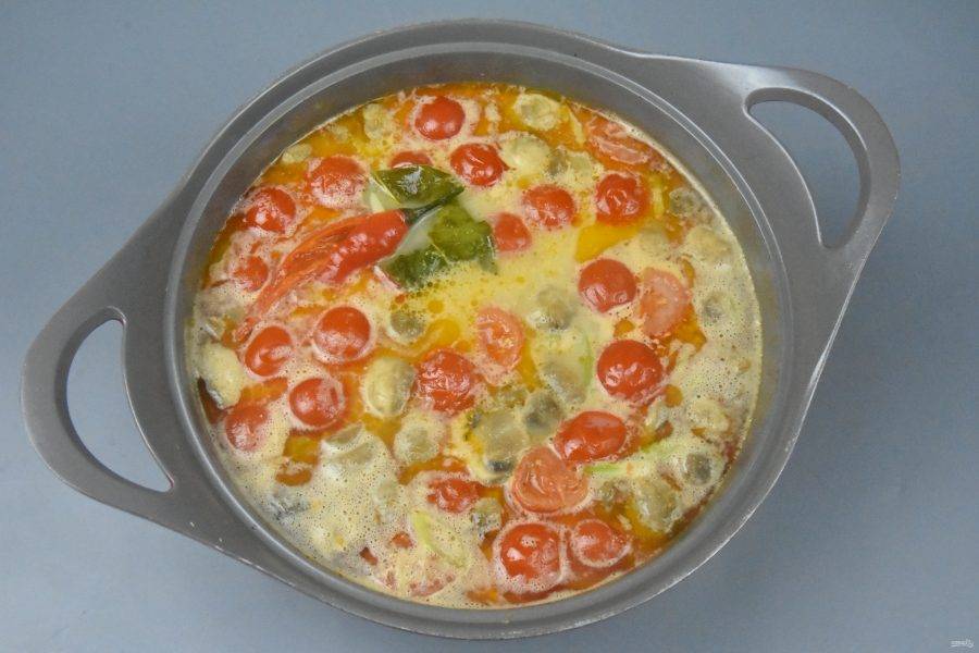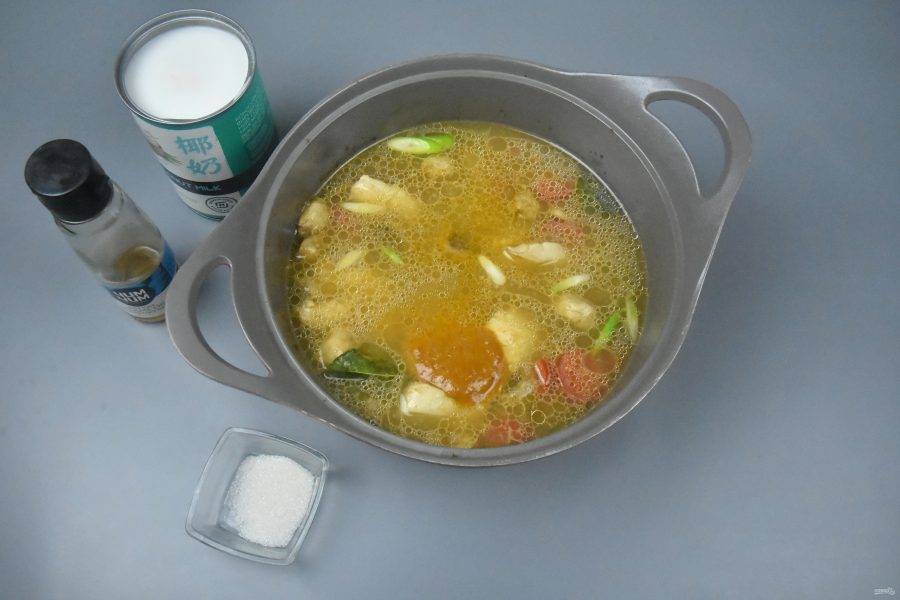 Влейте кокосовое молоко и на медленном огне доведите суп до легкого кипения. Через 2-3 минуты отключите огонь. Кокосовое молоко должно быть комнатной температуры, иначе оно может свернуться.