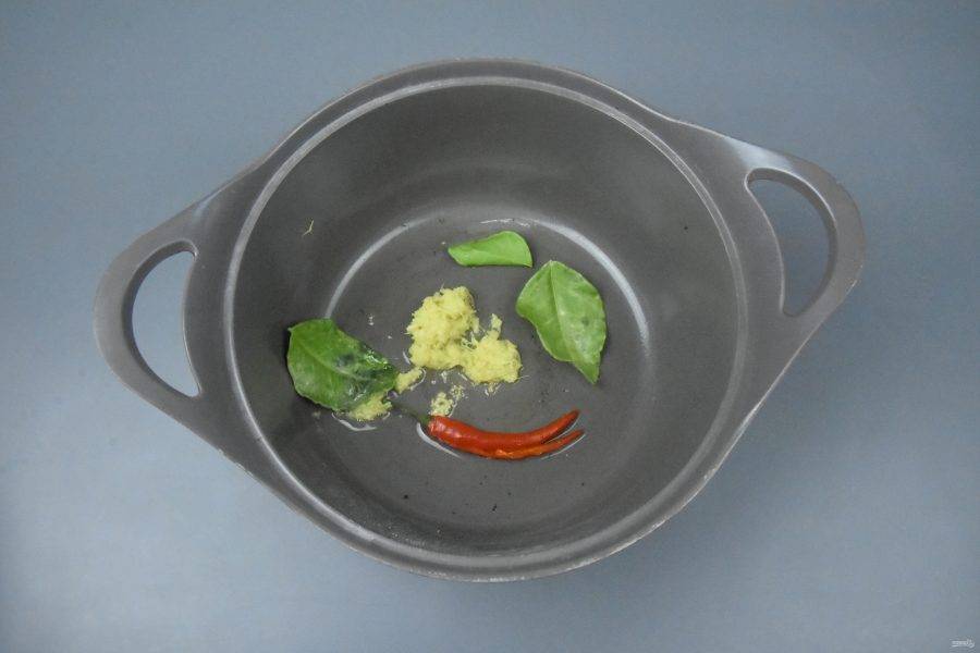 В кастрюле нагрейте немного рафинированного масла без запаха. Добавьте измельченный корень имбиря (галангала), острый красный перец и листья каффир лайма. Слегка обжарьте продукты в течение 1-2 минут, до появления аромата.