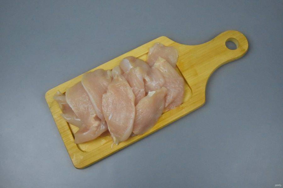 Филе куриной грудки зачистите от сухожилий, лишнего жира и соединительной ткани. Нарежьте мясо небольшими кусочками поперек волокон.
