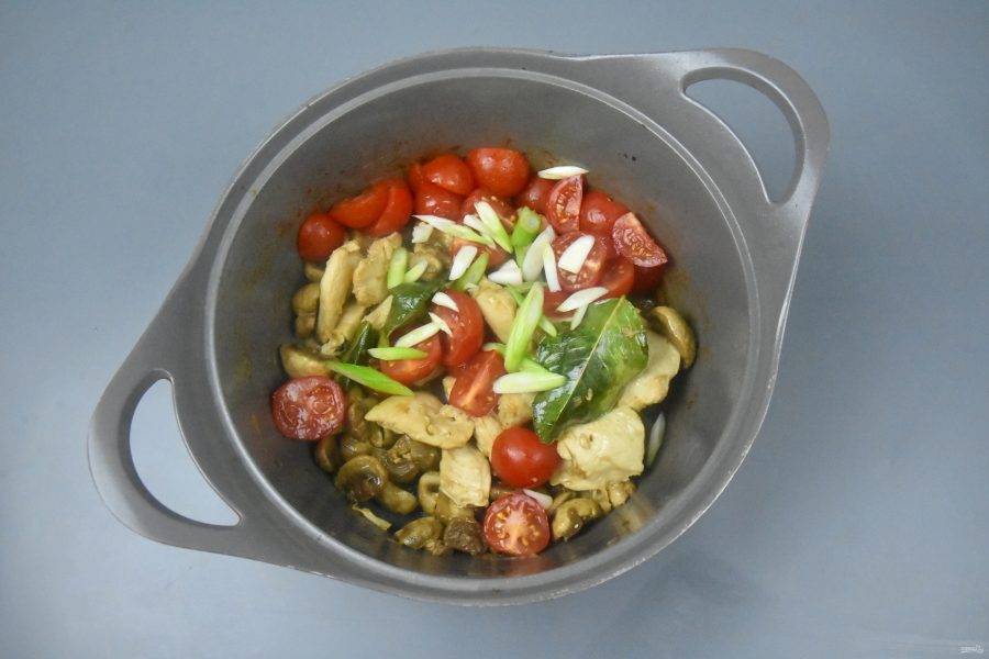Выложите томаты и зеленый лук. Аккуратно перемешайте и прогрейте все составляющие еще пару минут.