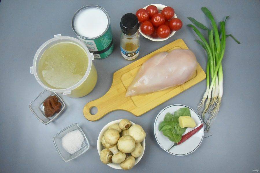 Подготовьте необходимые продукты для приготовления тайского супа Том Кха. Готовая паста Том Ям уже содержит в своем составе лемонграсс, чеснок, галангал, тамариндовую пасту, каффир лайм, но при желании вкусы можно усилить, добавив эти ингредиенты дополнительно. Корень галангала можно заменить имбирем. Если у вас в наличии имеется рыбный соус, можете использовать его вместо соли. Куриную грудку можно заменить на филе бедра, мясо будет более сочным.