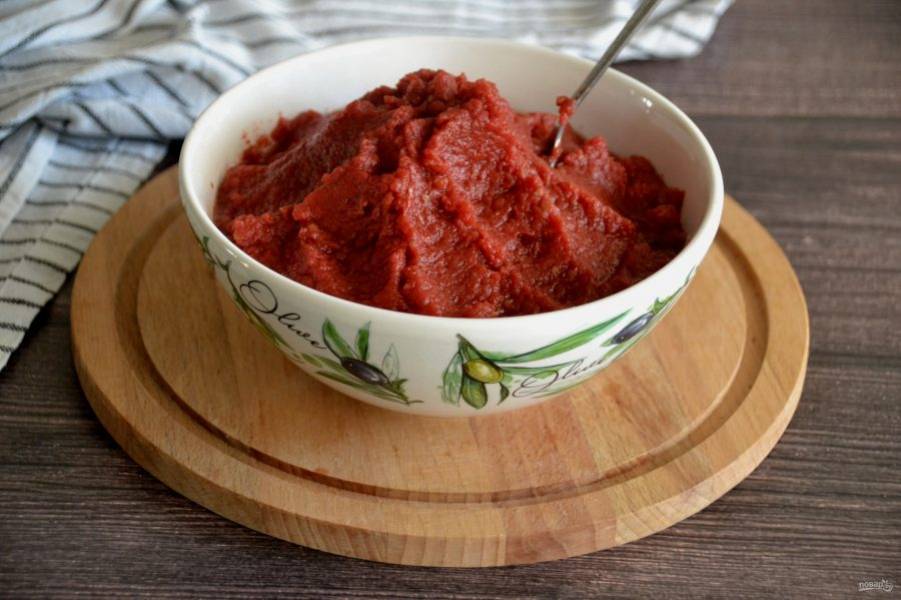 Готовая томатная паста должна быть достаточно плотной и не содержать много влаги.