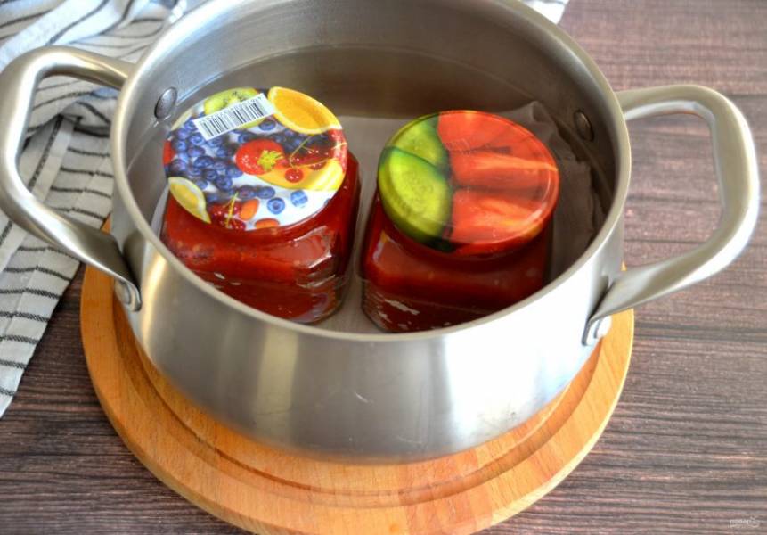 Готовую томатную пасту разложите по баночкам. Такую пасту можно заморозить порционно, а можно законсервировать обычным способом. Банки с томатной пастой установите в кастрюлю, дно которой застелено салфеткой, залейте горячей водой и стерилизуйте около 25-30 минут. После чего закройте крышками, переверните вверх дном и накройте чем-то теплым, например, пледом до полного остывания.