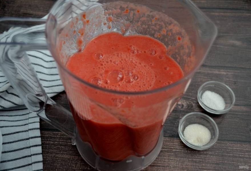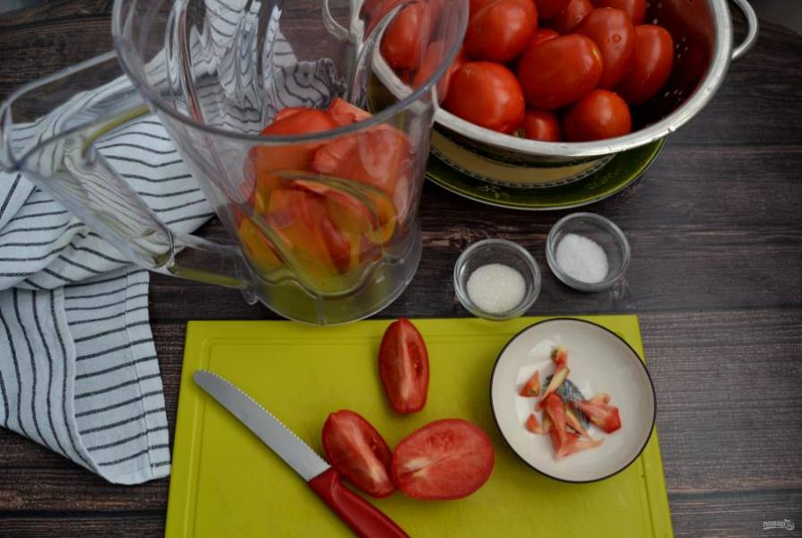 Измельчите помидоры любым удобным для вас способом: через мясорубку или блендером. Если вам не нравятся помидорные семечки в пасте, на этом этапе можно перетереть через сито.