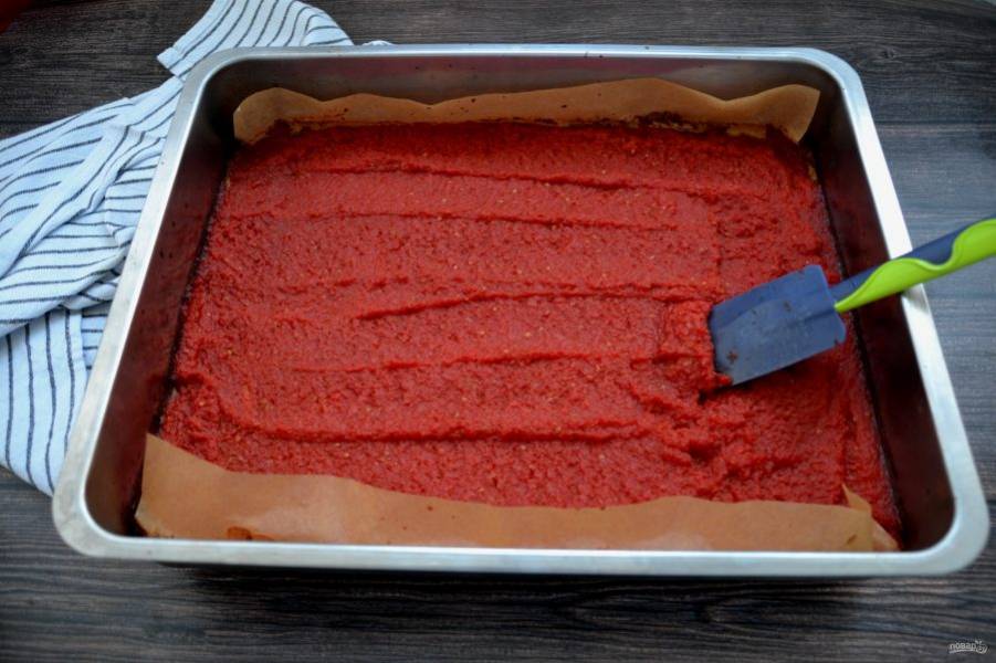 Перелейте томатную пасту в противень, включите духовку в режиме "верх-низ + конвекция" при температуре не ниже 75 градусов, но не выше 100 градусов примерно на 1 час. Если нет режима конвекции, готовьте со слегка приоткрытой дверцей.