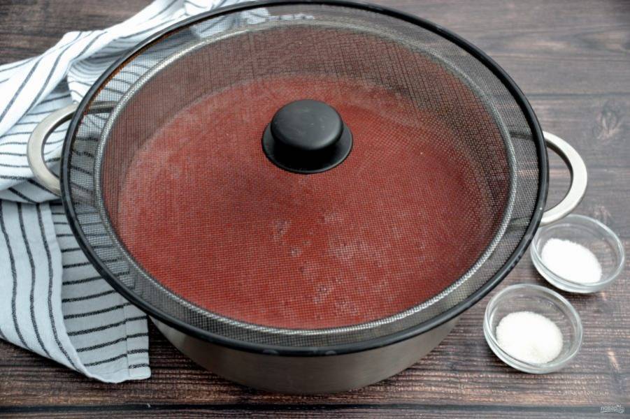 Накройте кастрюлю крышкой, но при этом сдвиньте ее, чтобы была возможность испарения жидкости, а лучше накройте такой сетчатой крышкой, так поверхность для испарения влаги будет больше. Когда часть жидкости испарится, можно добавить соль и сахар по вкусу.