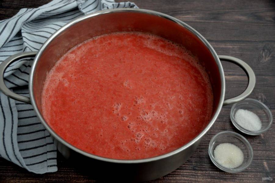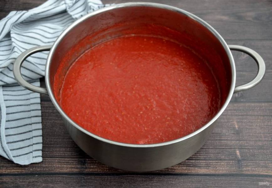 Перелейте помидорную массу в кастрюлю с широким дном, поставьте на средний огонь.