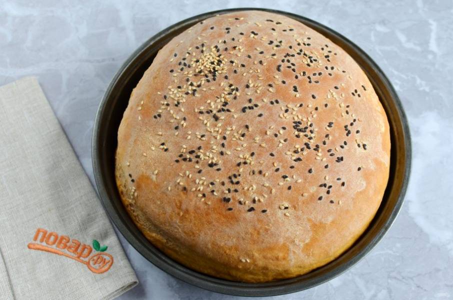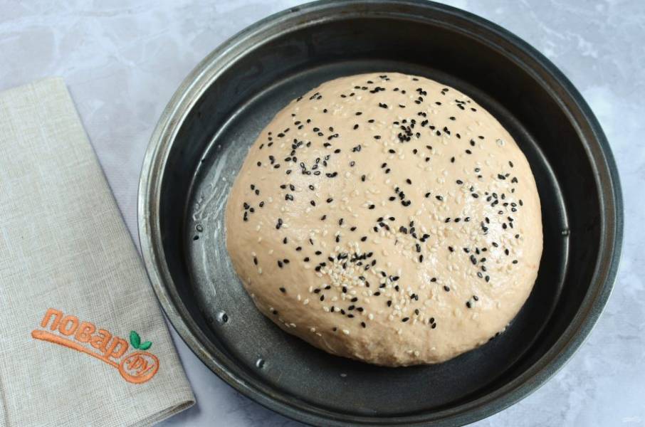 6. Смажьте форму маслом, положите сформированную булочку будущего хлеба, по желанию притрусите кунжутом. Поставьте в теплое место для расстойки на 20-30 минут.