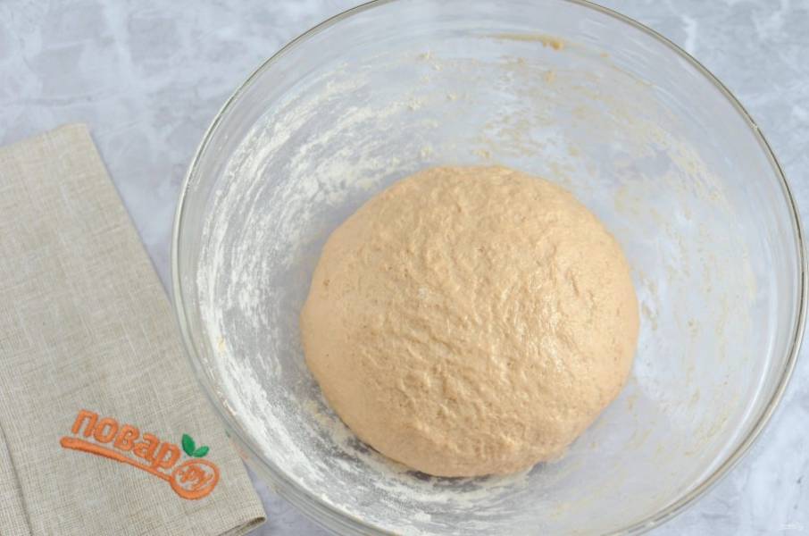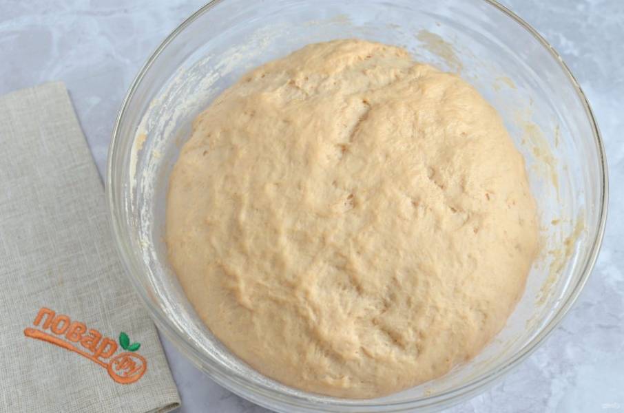 4. Замесите тесто, подсыпая муку, в самом конце влейте масло растительное и еще раз подмесите тесто. Оставьте в тепле, накрыв полотенцем, на 1-1,5 часа.