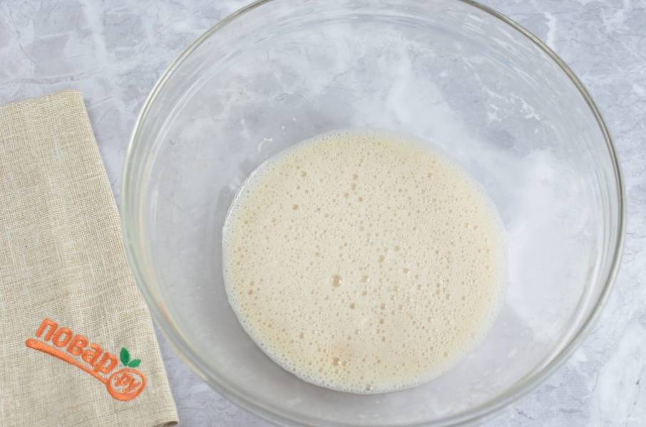 2. В теплой воде растворите дрожжи, сахар. Оставьте в тепле на 10-15 минут, чтобы дрожжи проснулись, образовалась пенная шапочка.
