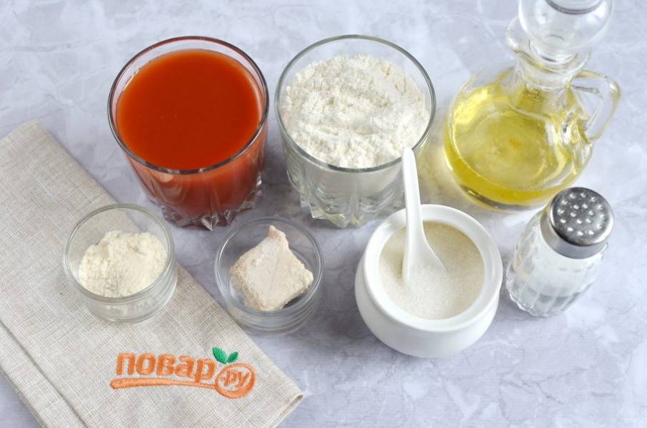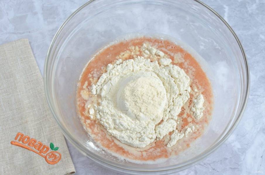 3. Добавьте соль, томатный сок, муку (часть) и чесночный порошок.