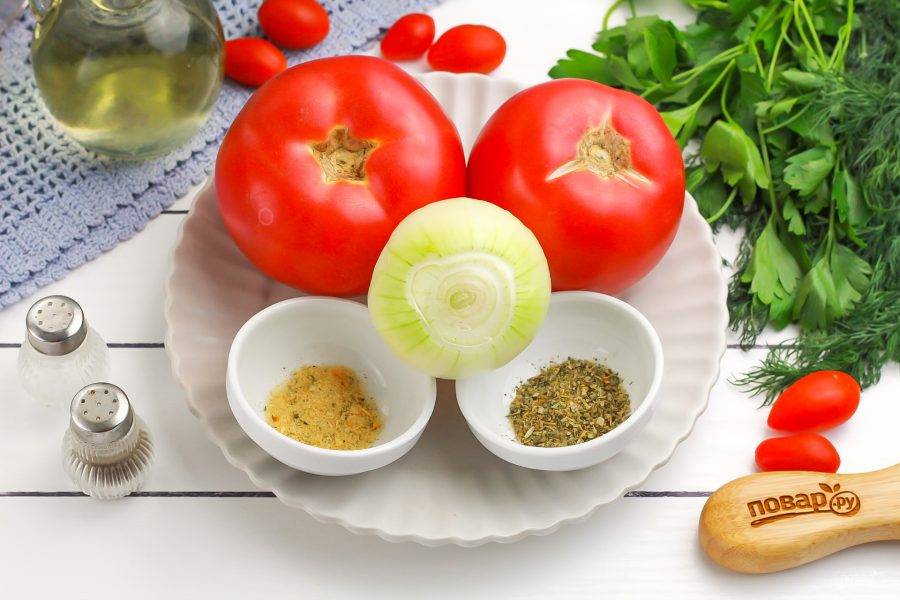 Подготовьте указанные продукты. Лук очистите от шелухи и промойте в воде. Помидоры также промойте и обсушите бумажными салфетками.