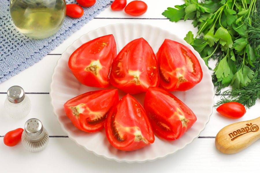 Разрежьте помидоры на несколько частей и вырежьте семенные блоки. Мелко не нарезайте, так как вам придется натереть их на терке с мелкими ячейками.