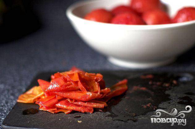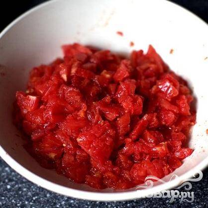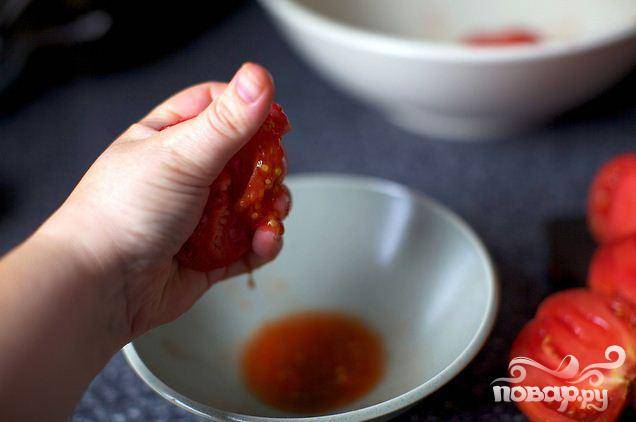 4. Разрезать помидоры на 2-4 части и отжать над миской, сохраняя сок.