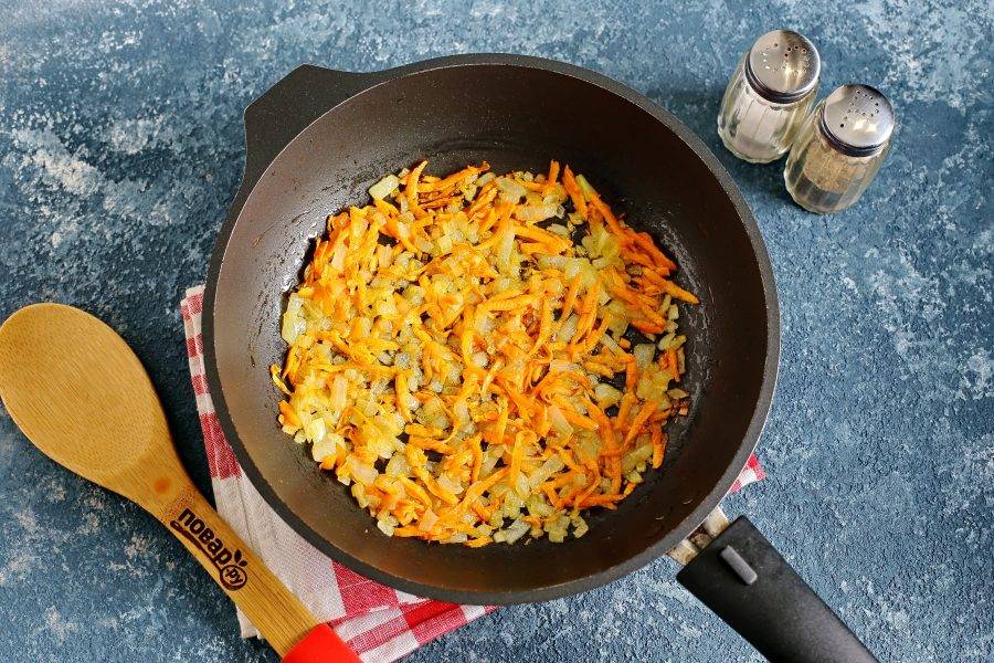 Добавьте томатную пасту и готовьте еще 2-3 минуты, после чего содержимое сковороды отправьте в кастрюлю к остальным ингредиентам.