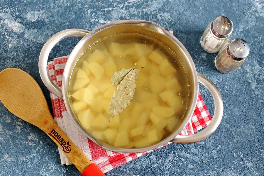 Добавьте необходимое количество воды, лавровый лист и соль по вкусу. Поставьте кастрюлю на плиту и варите до полуготовности картофеля и риса.