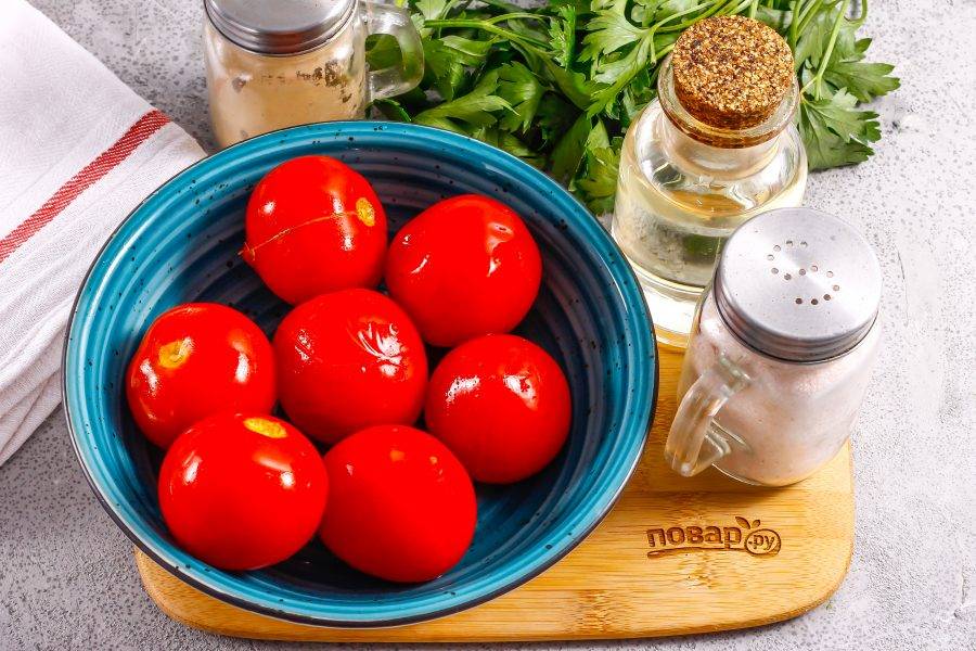 Помидоры промойте в воде, выложите в глубокую емкость и залейте кипятком на 10 минут для пропаривания, затем кипяток слейте и очистите томаты от кожуры.
