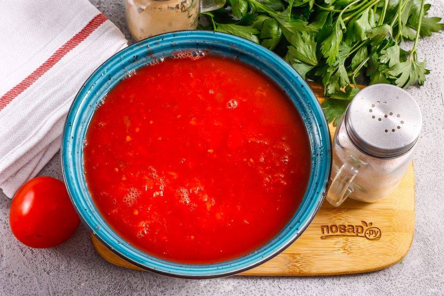 Затем залейте в емкость томатную массу и всыпьте соль, отварите все примерно 2 минуты.