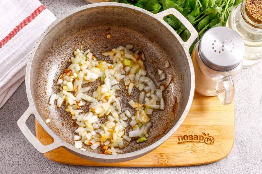 Половину очищенного репчатого лука нарежьте мелким кубиком и отпассеруйте в разогретом растительном масле примерно 3 минуты до румяности.