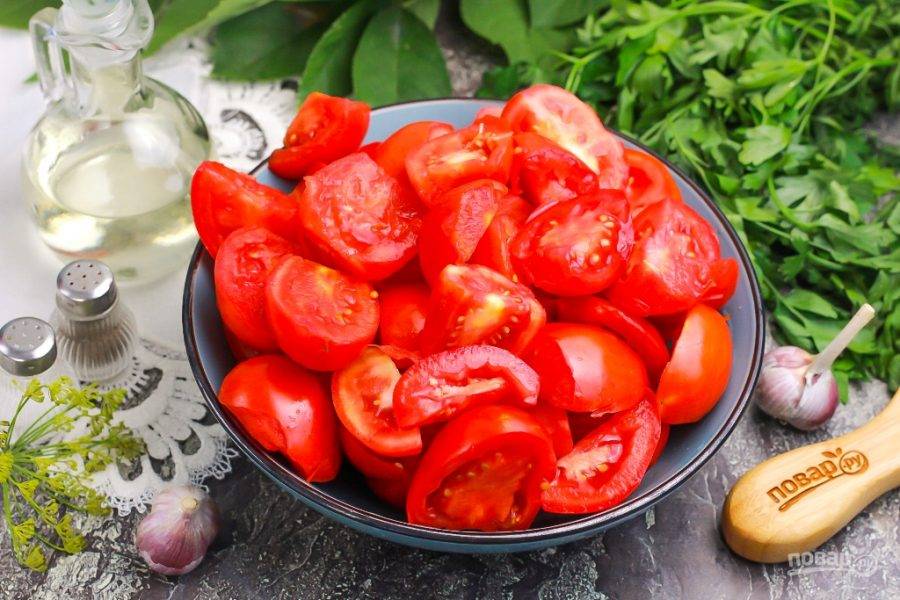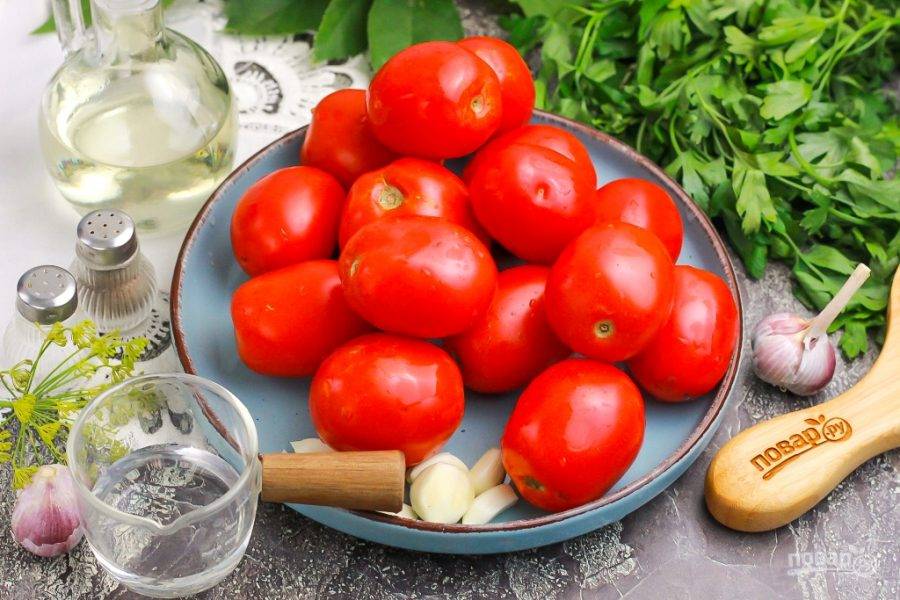 Подготовьте указанные продукты. Все томаты промойте в воде, смывая грязь, пыль, протрите бумажными салфетками. Очистите зубчики чеснока.