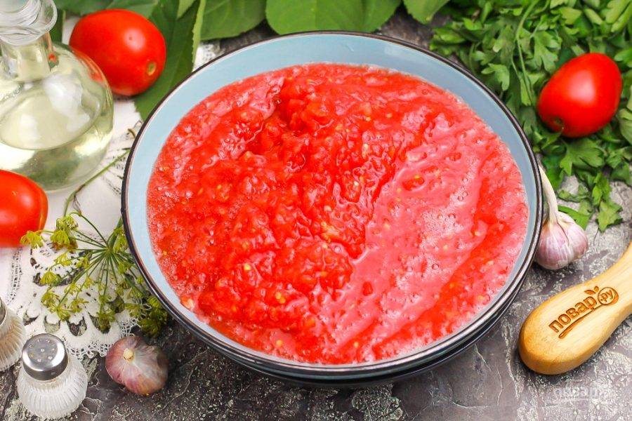 Пропустите половинки помидоров через мясорубку в глубокую емкость, получая томатную массу.