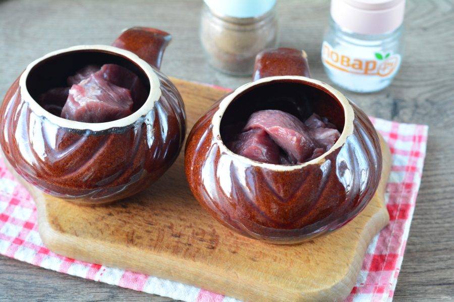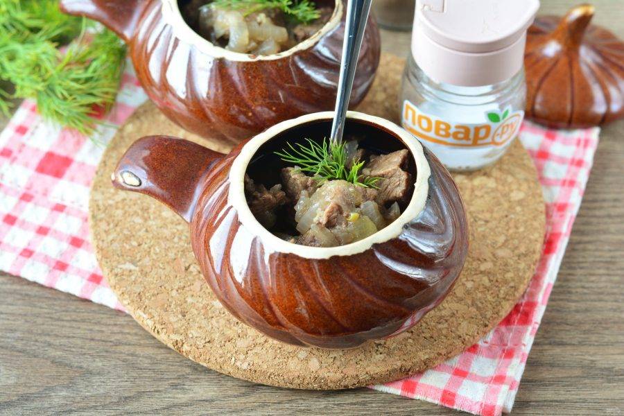 Влейте в каждый горшочек немного воды и отправьте томиться в духовку при температуре 150-160 градусов. Готовьте мясо в горшочках прикрыв крышками, около 90 минут. Говядина получится мягкой, тающей во рту.