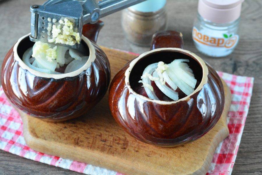 Выложите между кусочками говядины лук, выдавите в горшочки чеснок — он придаст мясу отменный аромат.