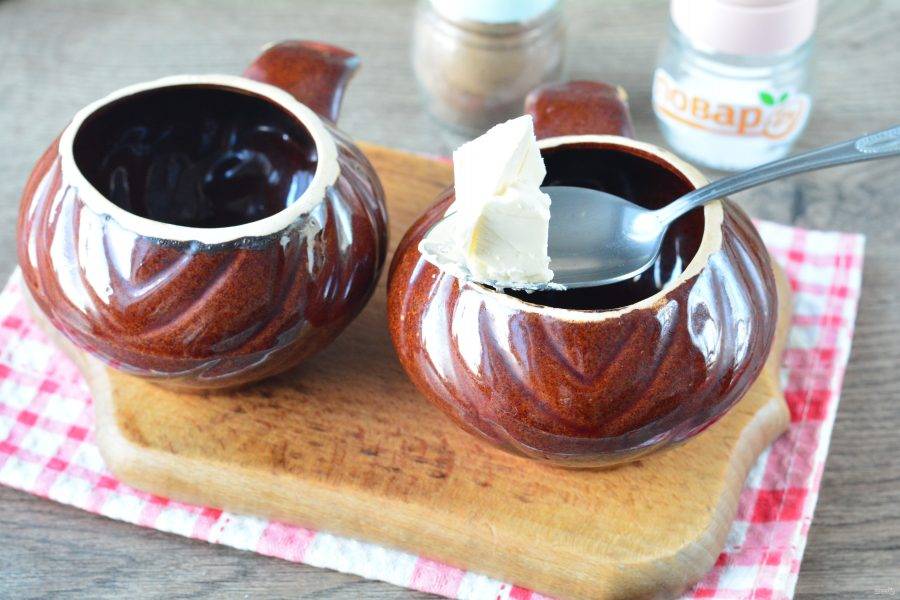 На дно глиняных горшочков выложите по щедрому кусочку сливочного масла.