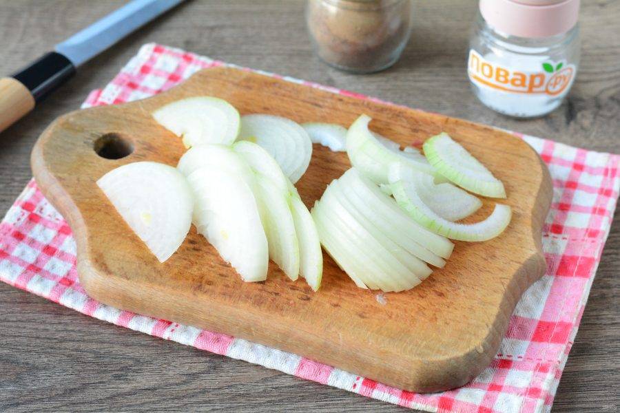 Нашинкуйте полукольцами репчатый лук.