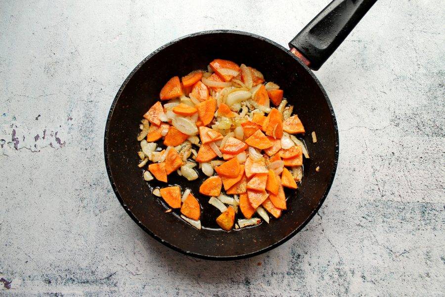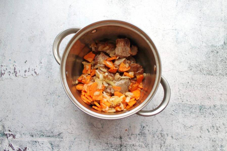 Мясо переложите в кастрюлю с толстым дном. На сковороде после мяса обжарьте порезанный репчатый лук, и морковь в течение 3 минут на сильном огне.