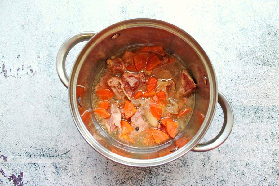 Переложите овощи к мясу, посолите, добавьте черный перец и влейте воду, чтобы она только покрывала мясо.