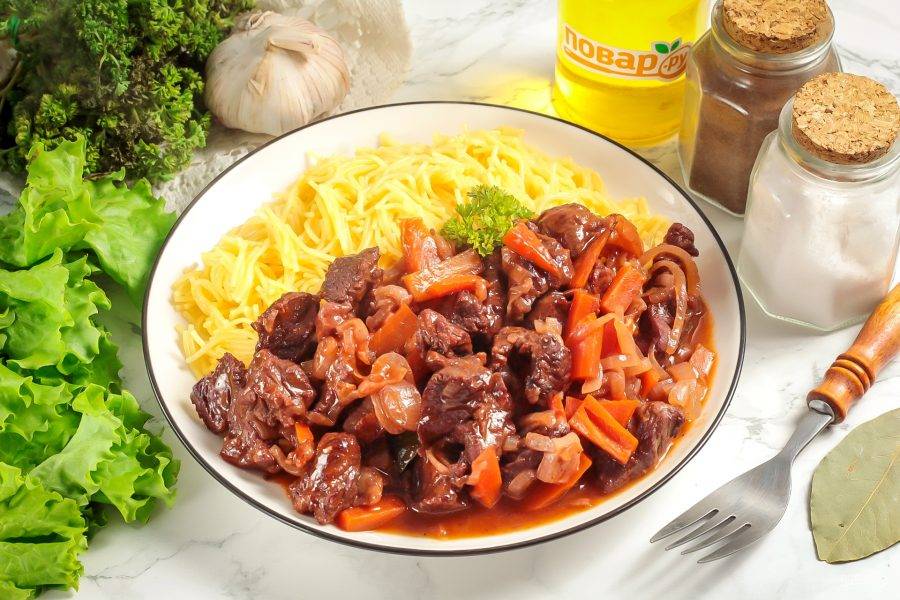 Выложите томленые говяжьи щечки на тарелку с любым гарниром и подайте к столу горячими.