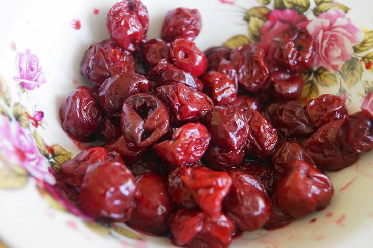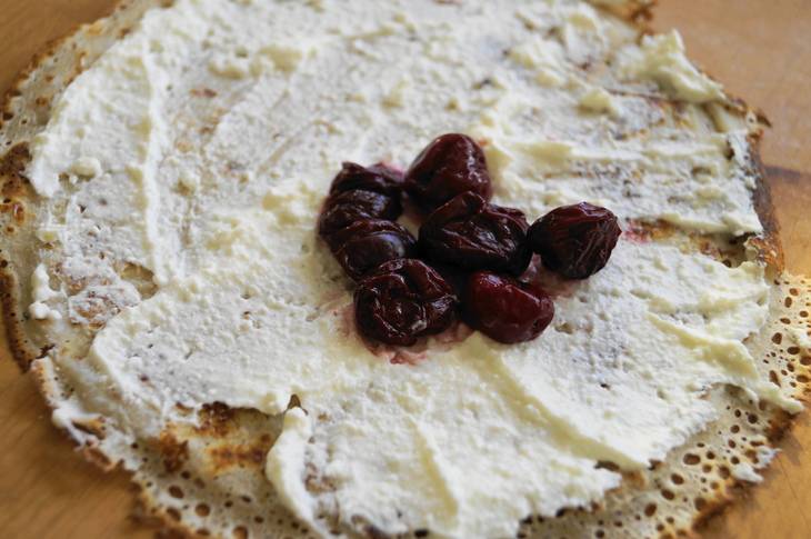 Намазываем слой творога на блинчики и в середину выкладываем вишню.
